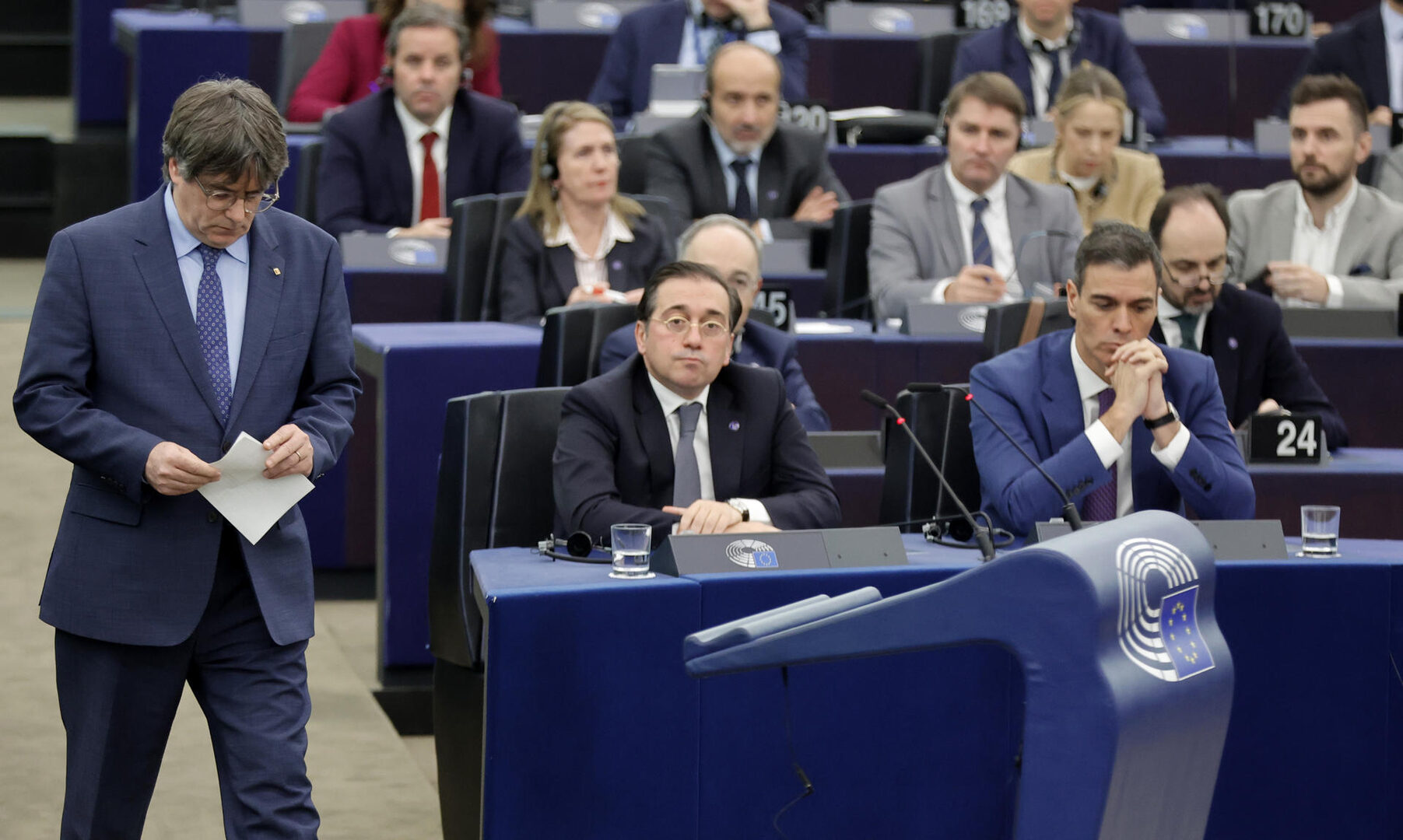 El expresidente catalán y eurodiputado de JxCat, Carles Puigdemont, pasa junto al presidente del Gobierno, Pedro Sánchez, y el ministro de Exteriores, José Manuel Albares, antes de tomar la palabra en el debate sobre la 'Revisión de la Presidencia española del Consejo' celebrado el pasado 13 de diciembre en el Parlamento Europeo en Estrasburgo. | EFE/Ronald Wittek