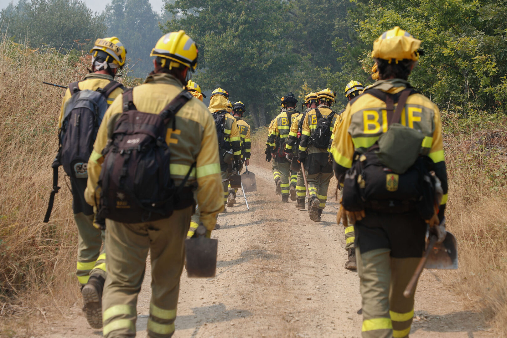 Miembros de las brigadas contra incendios se disponen a la extinción este miércoles de un fuego en la aldea de Monteseiro, perteneciente al municipio lucense de Fonsagrada. | EFE