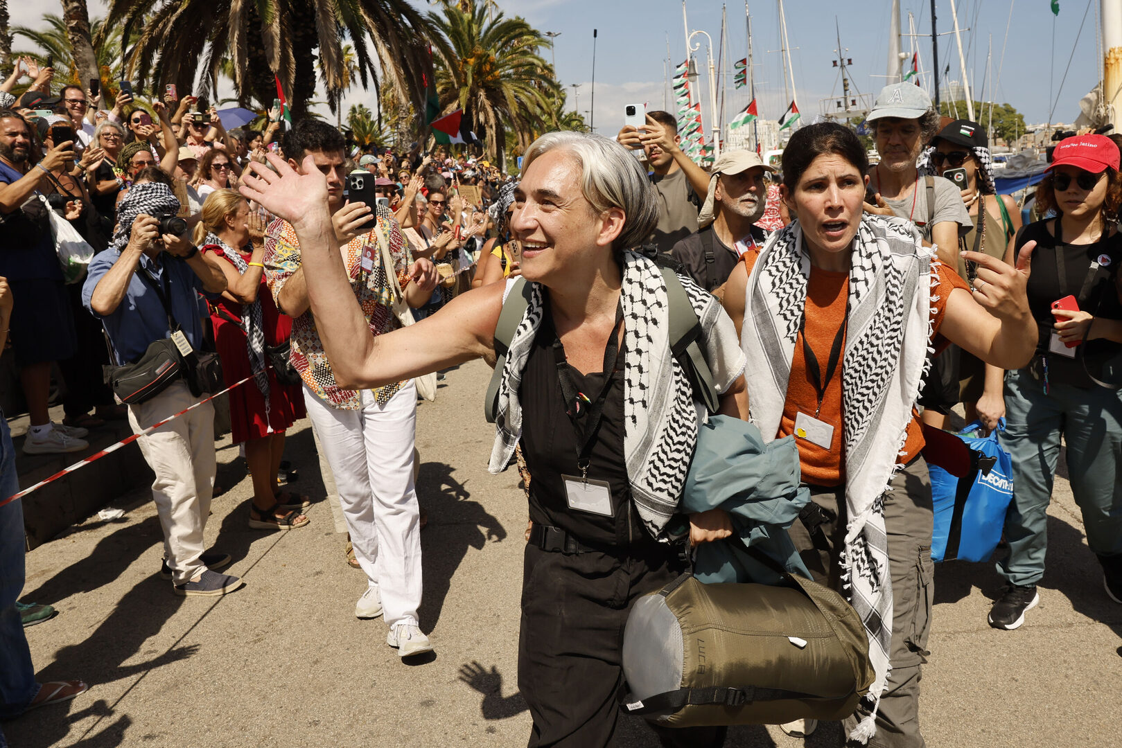 BARCELONA, 31/08/2025.- La exalcaldesa de Barcelona Ada Colau junto a los barcos que forman parte de la flotilla en el puerto de Barcelona este domingo. La flotilla Global Sumud sale este domingo desde Barcelona y con destino a Gaza, en una acción solidaria con el pueblo palestino en la que participan entidades de 44 países. EFE/ Toni Albir | EFE