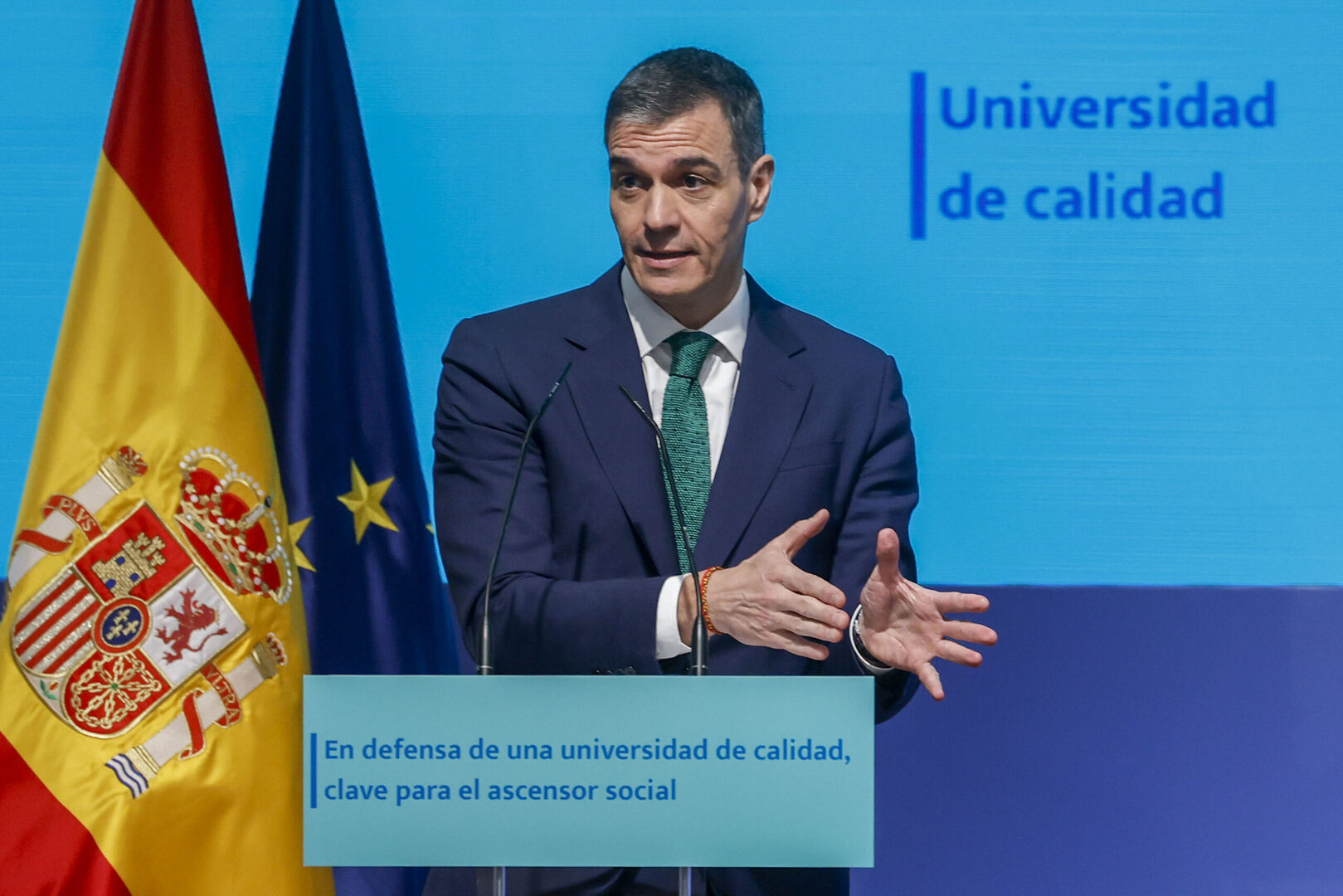 MADRID, 31/03/2025.-El presidente del Gobierno, Pedro Sánchez, da un discurso durante su asistencia a un acto de apoyo a la universidad pública 'En defensa de una universidad de calidad, clave para el ascensor social', este lunes, en Madrid. EFE/ Juan Carlos Hidalgo | EFE