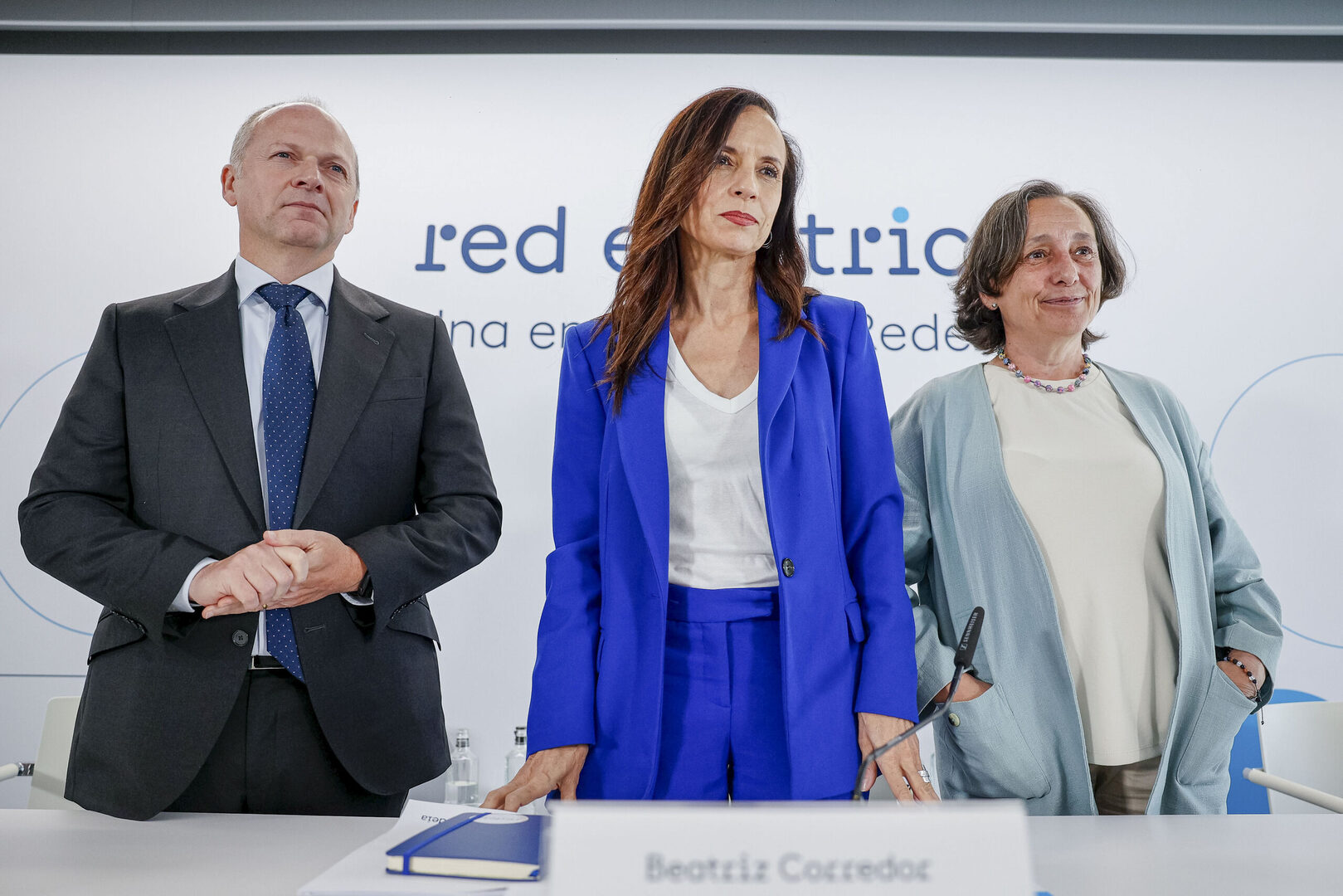La presidenta no ejecutiva de Redeia, Beatriz Corredor (c), junto a Roberto García Merino, CEO de Redeia, y Concha Sánchez, directora general de Operación de Red Eléctrica, durante la rueda de prensa ofrecida para presentar el informe del operador del sistema sobre el apagón del pasado 28 de abril en cumplimiento de la normativa vigente, este miércoles en Madrid. EFE/ Daniel Gonzalez | EFE