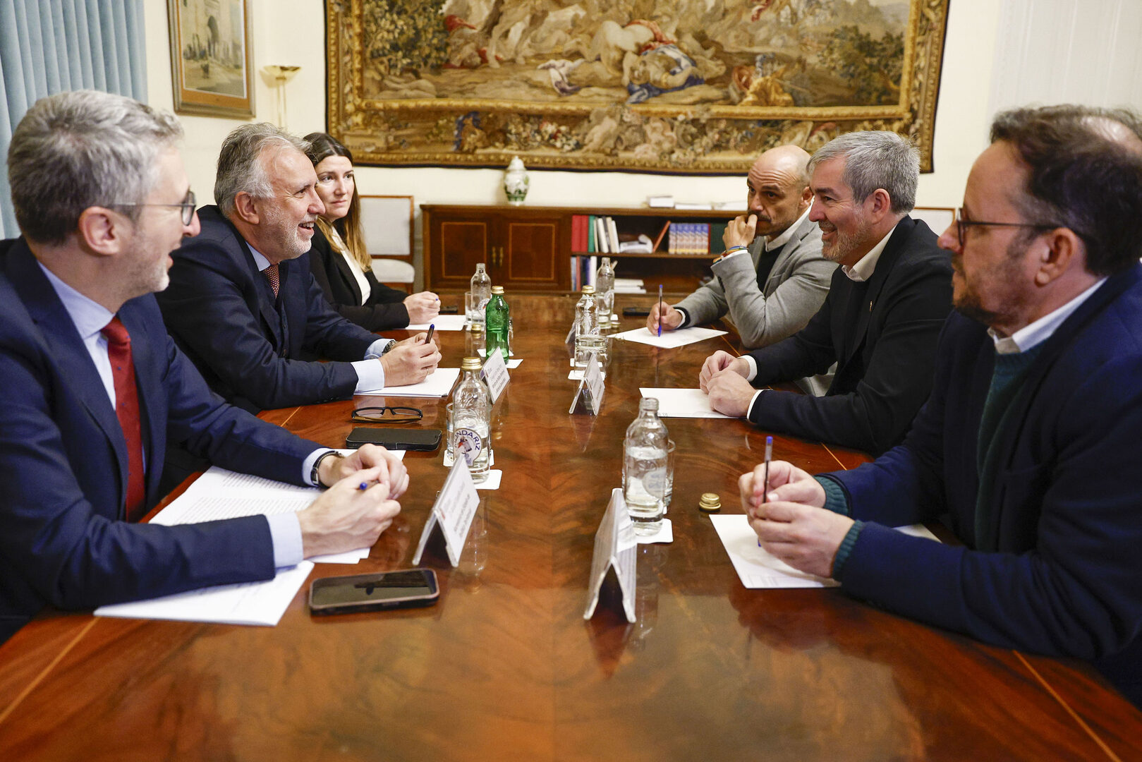 MADRID, 09/01/2025.- El ministro de Política Territorial y Memoria Democrática, Ángel Víctor Torres (2i), y el presidente de Canarias, Fernando Clavijo (2d), durante la reunión mantenida para intentar alcanzar una respuesta al colapso de los recursos de acogida de menores migrantes en las islas, agravado por las continuas llegadas por mar en los últimos días de diciembre y primeros de enero, este jueves en Madrid. EFE/Rodrigo Jiménez | EFE