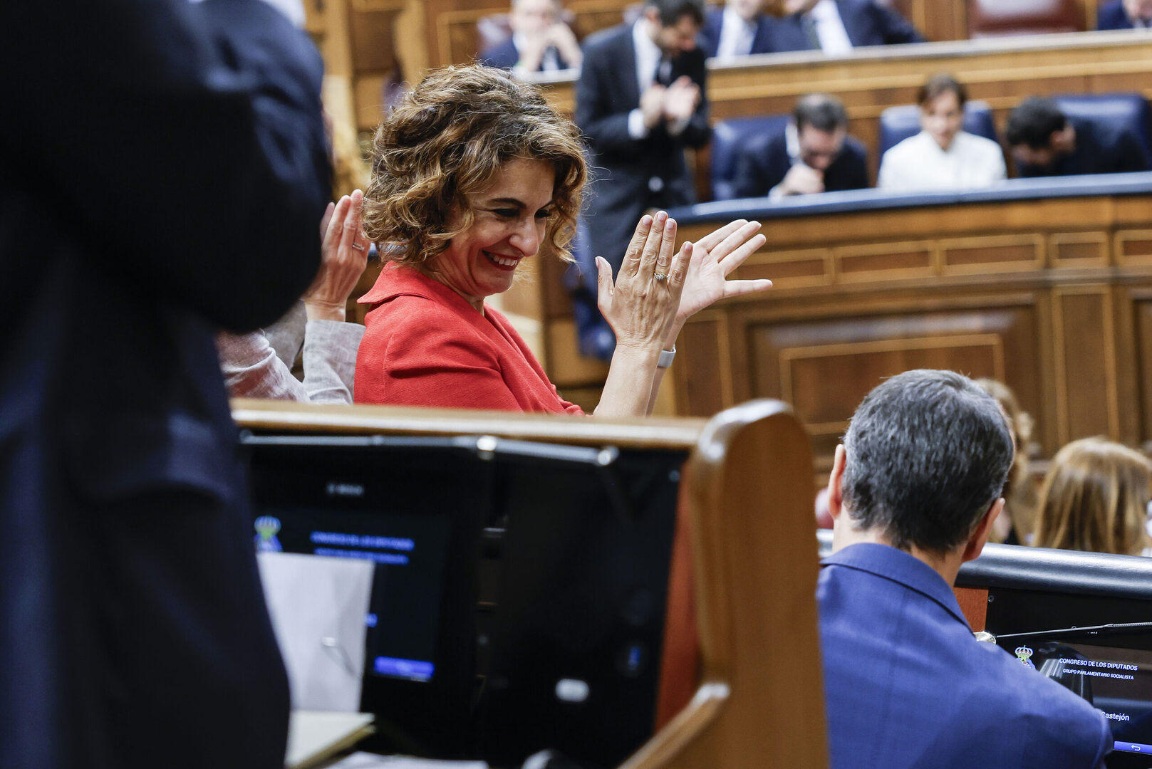 La vicepresidenta María Jesús Montero aplaude al presidente del Gobierno Pedro Sánchez después de su intervención en el Congreso por la guerra de Irán | EFE
