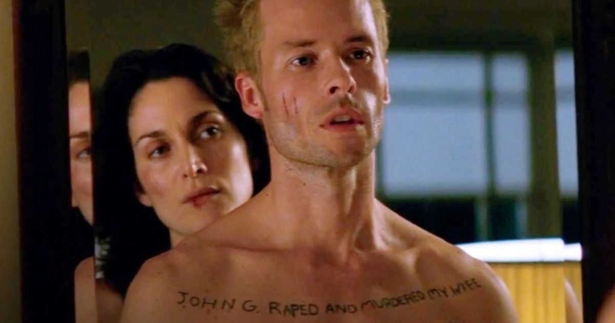En Memento, Guy Pearce es un exagente de seguros que ha perdido la memoria reciente e investiga el asesinato de su esposa. Ayudándose de sus notas y tatuajes, que le ayudan a recordar lo esencial, el peculiar investigador se ve envuelto en una intriga repleta de dudosos personajes mientras lucha por recordar y encajar las piezas de su pasado... piezas que la película nos va presentando litearlmente al revés.